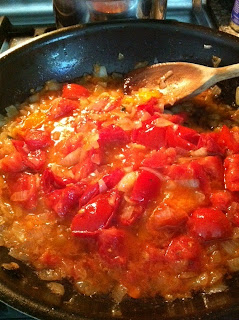 In a large skillet, heat oil until warm and add the onions. Extra Virgin Olive Oil smokes easily so don’t have the heat too high. Saute the onions until soft and translucent, not caramelized. Add chopped tomatoes and simmer over low to medium heat, stirring every few minutes to ensure vegetables cook evenly. Onions and tomatoes should be well oiled, so add more oil as needed.
